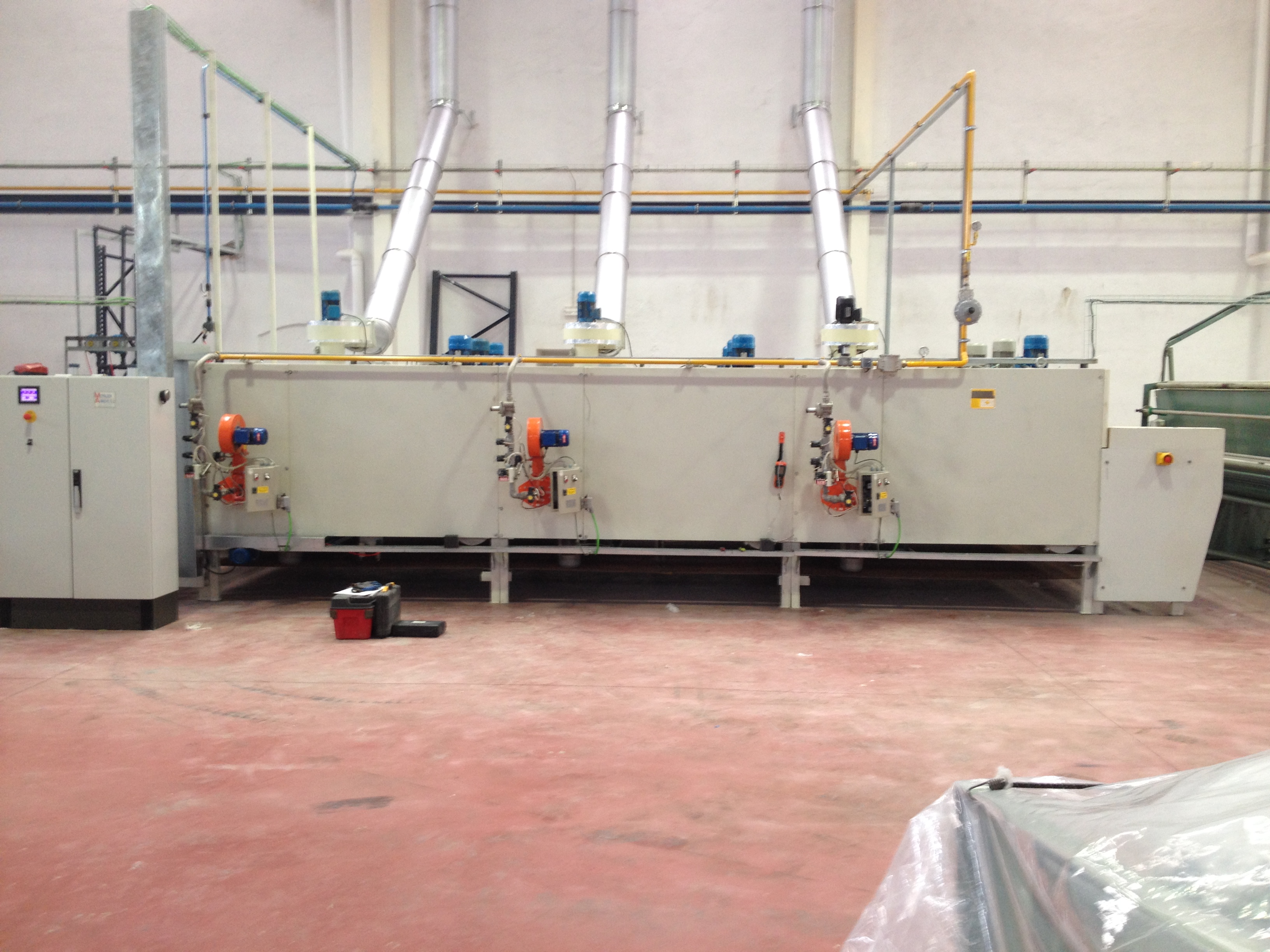 El aporte calorífico se efectúa por medio de quemadores , controlados en zonas independientes, con reguladores modulantes. Turbinas para mover el aire en la cámara de cocción y para la extracción de humedad. Compuertas para los quemadores accionadas por cilindros neumáticos.